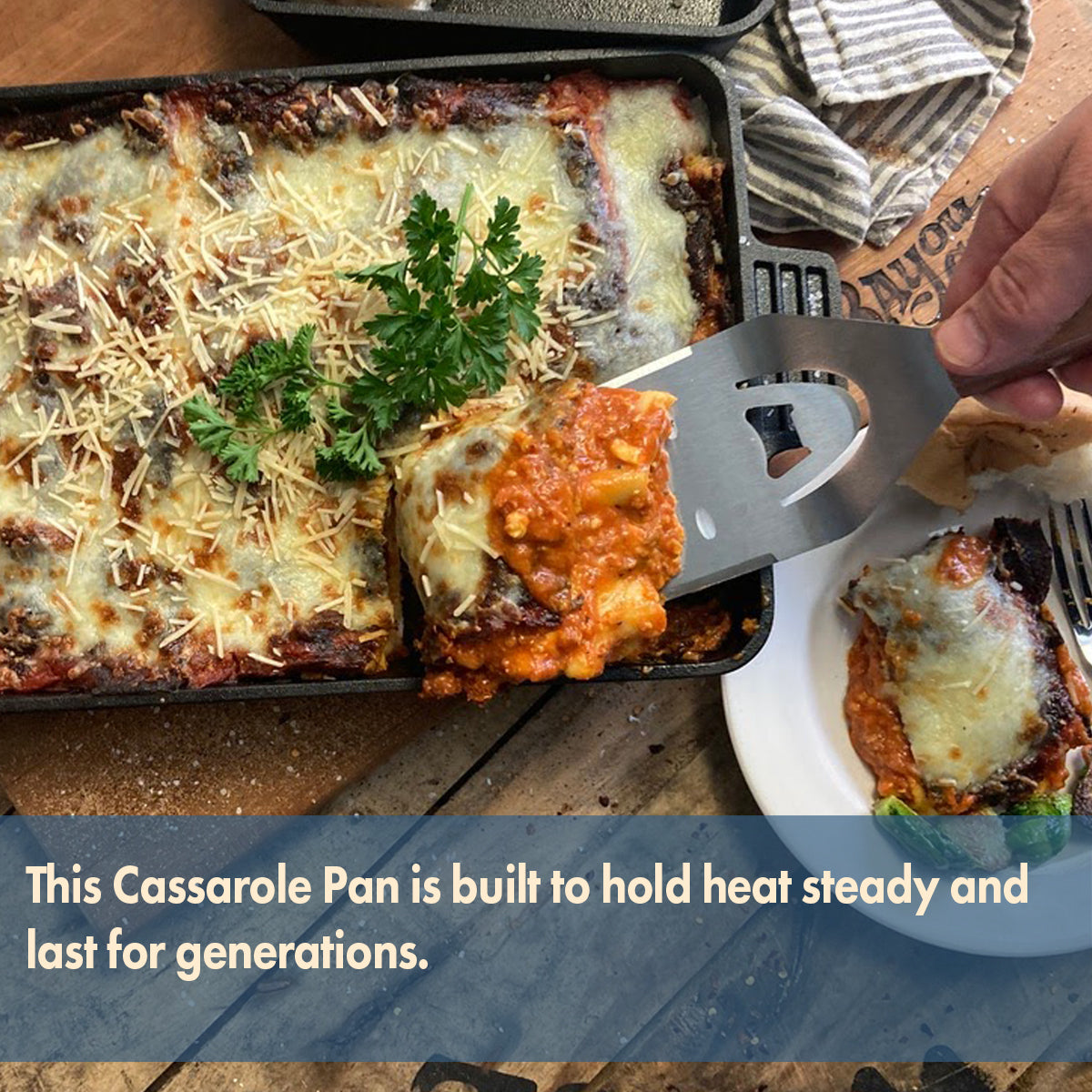 This 9 x 13-in Bake Pan retains heat evenly, making it ideal for baking cornbread, biscuits, cobbler, and deep dish pizza. Perfect for roasting chicken and pot roast. Gather with family and friends for warm dinners or Sunday get-togethers. Whatever occasion, Bayou Classic cast iron cookware adds a warm farmhouse feel to the modern kitchen. Bottom of pan is etched with an alligator for a unique bayou detail.