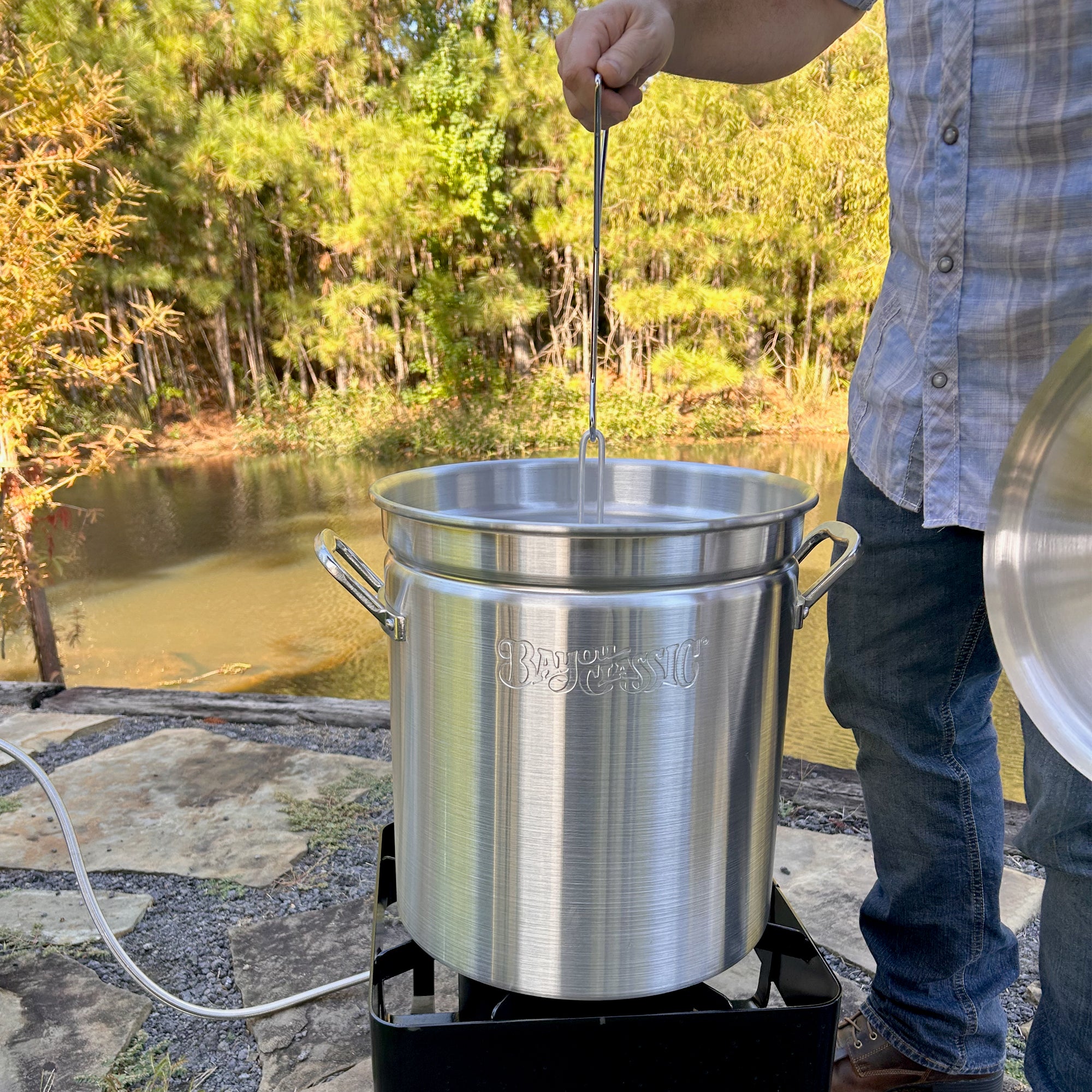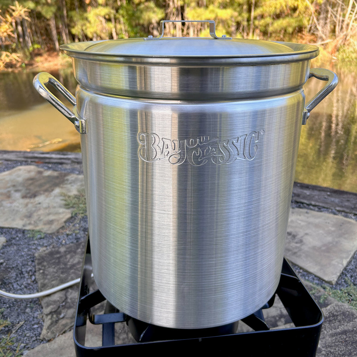 This versatile stockpot can also be used for large batch outdoor cooking of shrimp, crabs, corn, peanuts, and low country boil.